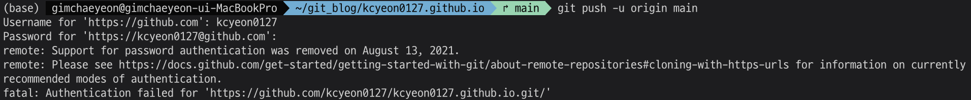fatal: Authentication failed for 'https://github.com/kcyeon0127/kcyeon0127.github.io.git/'